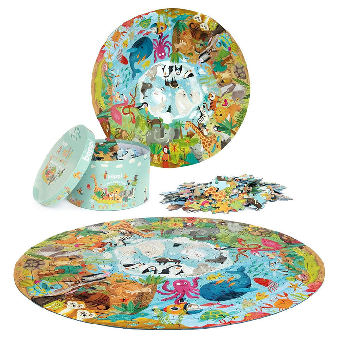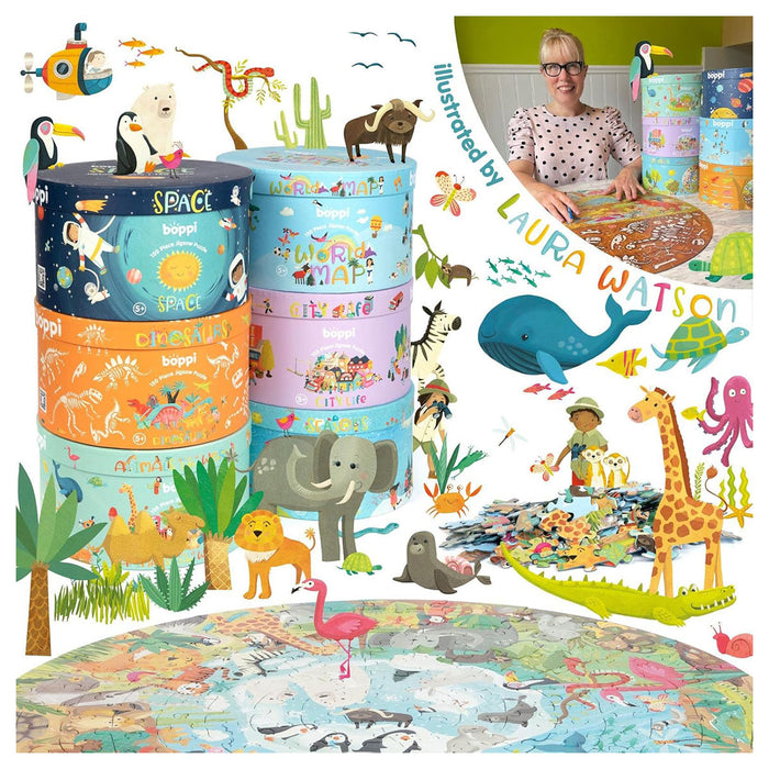 Boppi Animals Around the World Jigsaw Puzzle is a vibrant and educational 150-piece puzzle illustrated by Laura Watson. It features wildlife from various ecological environments - jungle, desert, arctic, ocean, and savannah - offering a global exploration experience. The puzzle pieces are made from 100% recycled card, ensuring an eco-friendly and durable construction. Each piece is 3-layered with a coated finish and hard backing, making them suitable for little fingers. When completed, the puzzle has a diameter of 58cm and comes with a 30cm fold-out image sheet to assist with assembly. It is packaged in a colourful round gift box, making it an ideal gift for young learners.