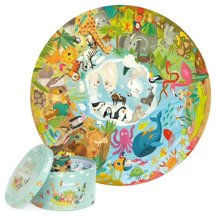 • 150 Piece Round Jigsaw Puzzle featuring Animals around the world.