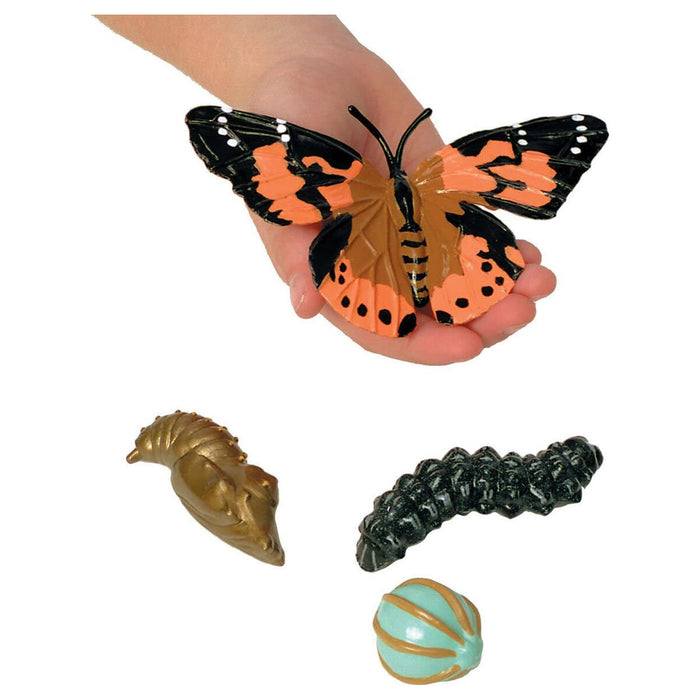 With these Butterfly Life Cycle Stages figurines children can see how butterflies change as they grow! These oversized, anatomically correct figures have been accurately painted and sculpted to show the four stages of the butterfly's development: Egg - 2.5cm Larva - 6.5cm Chrysalis - 5.5cm Adult Butterfly -10.5cm Showing the miracle of metamorphosis, this detailed, four-piece set is made of durable, flexible plastic and is fun and educational. Mix them up and encourage your child to place them in the correct order. Oversized for little hands. Fun Fact #1 Painted Lady butterflies are native throughout the world with the exception of Australia and New Zealand. Fun Fact #2 A Painted Lady caterpillar will grow more than 10 times its original size and moult 5 times before becoming a chrysalis!