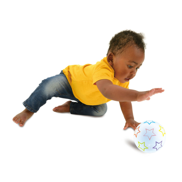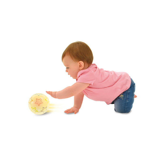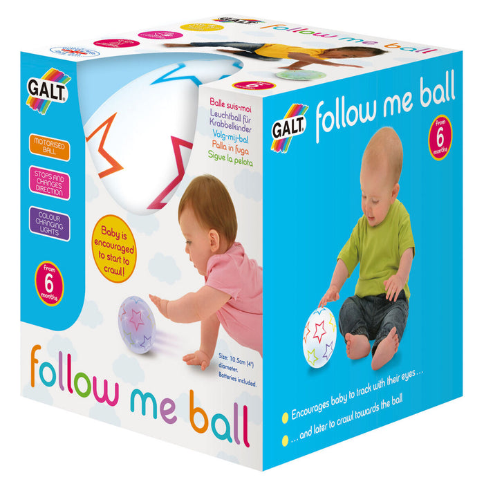 The Follow Me Ball is motorised and lights up when it moves! It also changes colours and it encourages baby to track with their eyes...then later to crawl towards the ball. Watch it roll along then stop and change direction! Babies will be captivated by the random movement and changing colours. A younger baby will track the ball with their eyes and reach out for the toy while an older baby will be encouraged to crawl towards the ball. Features a new external switch.