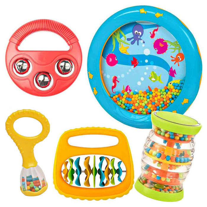 • Includes Rainbow Shaker, Baby Maraca, Bells, Ocean Drum, and Clip Clap rattle.