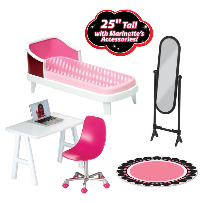 • Includes all the accessories needed to play out Marinette's story including her design desk with a chair, a laptop, bed, mirror, and her signature round rug!