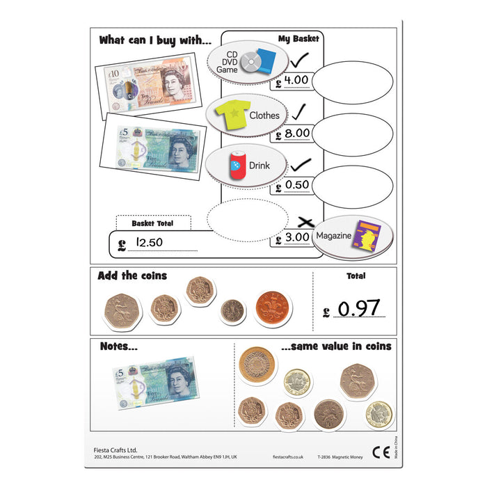 Children use the magnetic money to work out how much to pay, how to pay the correct amount, how much change is needed if they pay more than the exact amount, and they can do it over again until they get it right by simply moving the money around on the board. No messy scribbles, no pencils or rubbers…just magnetic money. Complete with a sturdy board and a dry-wipe marker. Board and pieces easily stored in pack.
