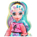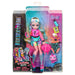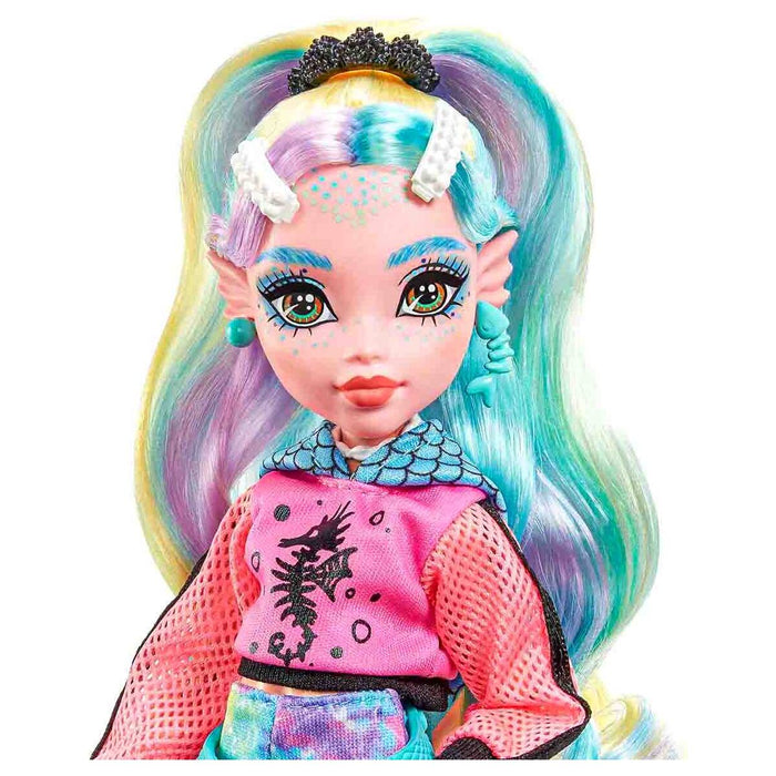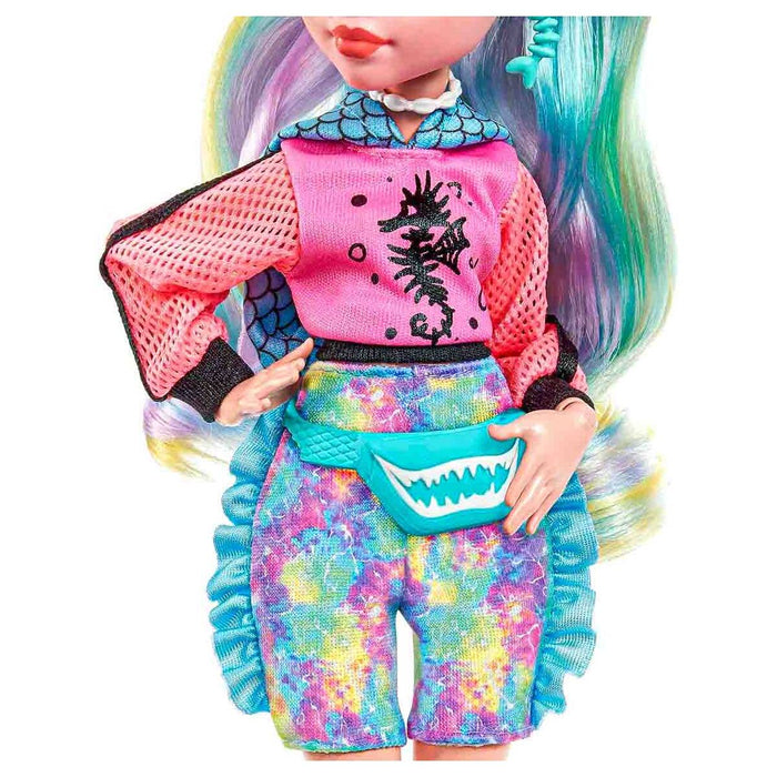 Monster High ghouls are strutting the school hallways in scream-tastic style! Lagoona Blue doll wears a fin-tastic fashion featuring a hot-pink hoodie with mesh sleeves and a trendy, tie-dye bike shorts romper. Gore-geous details include a sea monster-inspired waist bag, sunglasses and freaky-fab platform sandals, while her calves feature blue shading and delicate fins! Take her look to the next level with a 'metallic', fish scale-detailed swimsuit and to-die-for accessories, like a seashell backpack, snacks and a smartphone.