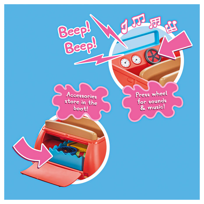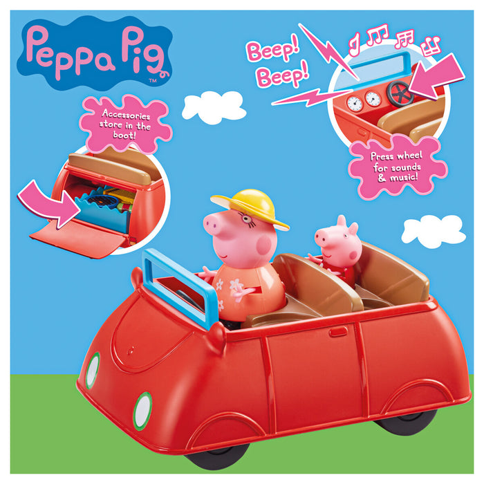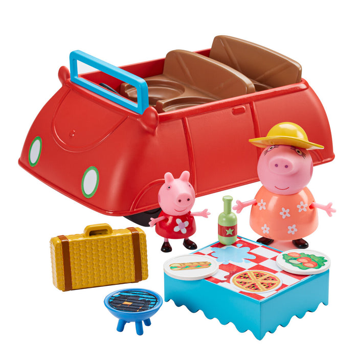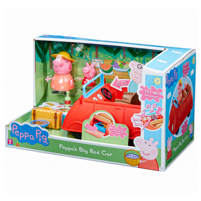 Peppa Pig Peppa's Big Red Car is everything you need for a Peppa Pig adventure! Take Peppa and Mummy Pig on a picnic trip! Press the steering wheel to hear music and sound effects! Includes picnic hamper, blanket, food, BBQ, Peppa and Mummy Pig figures. Everything stores away inside the boot! Free wheeling classic red car with room for all the family!