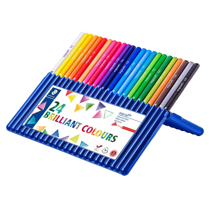 This 24 pack Staedtler Ergo Soft Coloured Pencils feature an Anti-Break System (ABS) with high-quality lead cores surrounded by a white protective coating. It is so hard and resistant that the break-resistance of the coloured lead is increased by up to 50 per cent, making the pencil up to 30 per cent stronger! The pencils have apt ergonomics, thanks to the triangular shape which is really comfortable to hold in the hand. They come supplied in the practical stand-up Staedtler box. The box includes 24 vibrant assorted colours. The lead is soft and break-resistant and has a diameter of 3 mm. There is a name box on each pencil so the owner can add their name for easy identification.