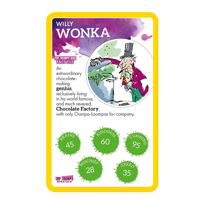 The entertaining, educational card game Top Trumps celebrates Roald Dahl. Discover 30 gloriumptious characters from the world's no.1 children's storyteller. There's Matilda, the BFG and Charlie and the Chocolate Factory and more! Who is the brainiest character? Can anyone beat Willy Wonka's cunning rating? Add this pack to Volume 2 for a bumper Roald Dahl Top Trumps extravaganza! Prepare to outsmart your opponents, discover new and exciting facts and duel your way to becoming the Top Trump!